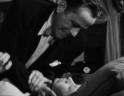 It's common Hollywood history that he and his first wife Virginia Mayo were known as "the battling Bogarts." So we know this was never a man to fuck with. Such a man is maybe too quick to violence even in WW2 approved locales. Ray is able to locate the monster underneath all the newly-slathered CASABLANCA heroism and underneath the monster, the sweet poet soul in the process of being crushed by the combined weight. Once the war is over and there's no one left to legally kill, the monster in the Bogart persona starts to crack through the detective/war hero/romantic lead mask, right along the crow's feet, and his dormant Frankenstein monster starts trying to reach out to crush someone.